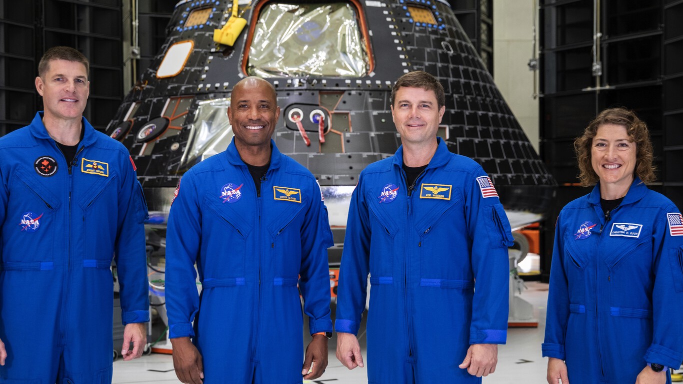 Hansen, Glover, Wiseman y Hammock Koch, junto a la cápsula Orión en el Centro Espacial Kennedy.