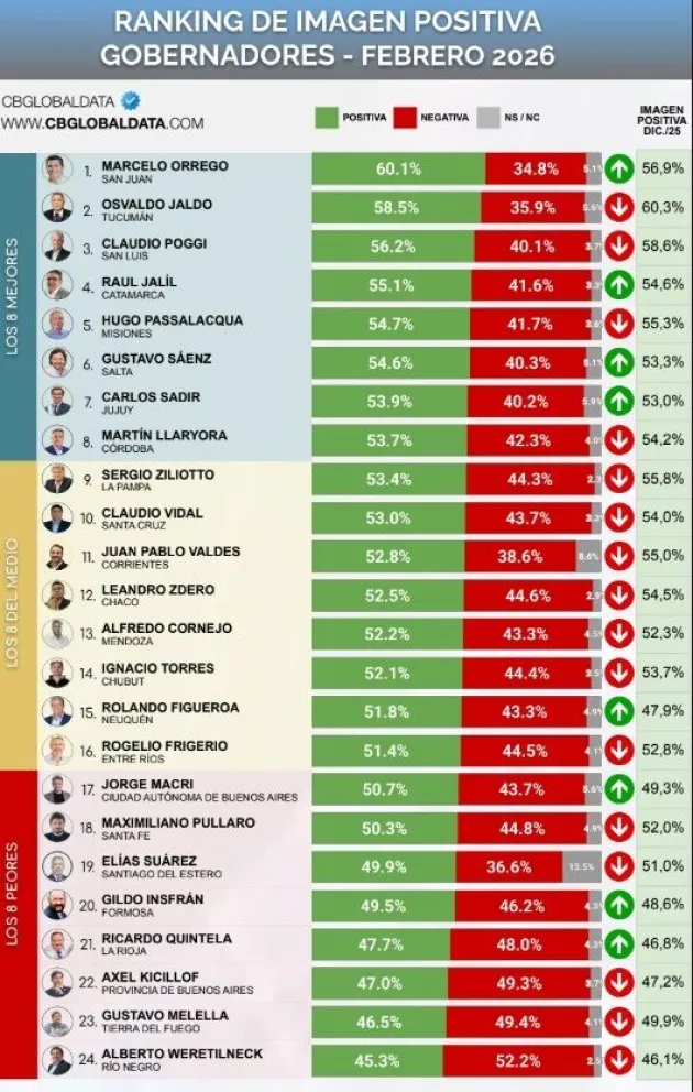 En este ranking, el gobernador de San Juan aparece primero en el ranking con una imagen positiva del 60,1% y una imagen negativa del 34,8%, con un 5,1% de personas que reservaron su opinión.