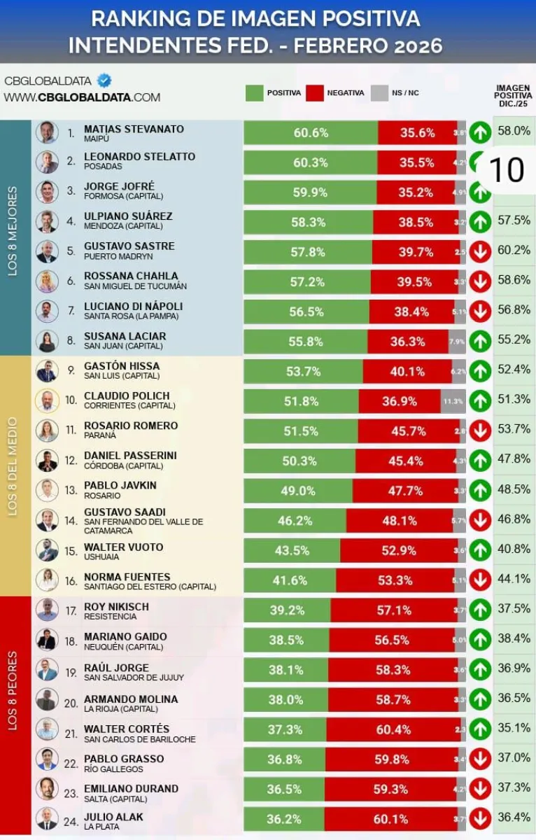 En ese sentido, Laciar se ubica en el puesto 8, entre los ocho jefes comunales mejor valorados en todo el país. La intendente de Capital reúne un 55,8% de imagen positiva frente a un 36,3% de imagen negativa y un 7,9% que no contestaron.