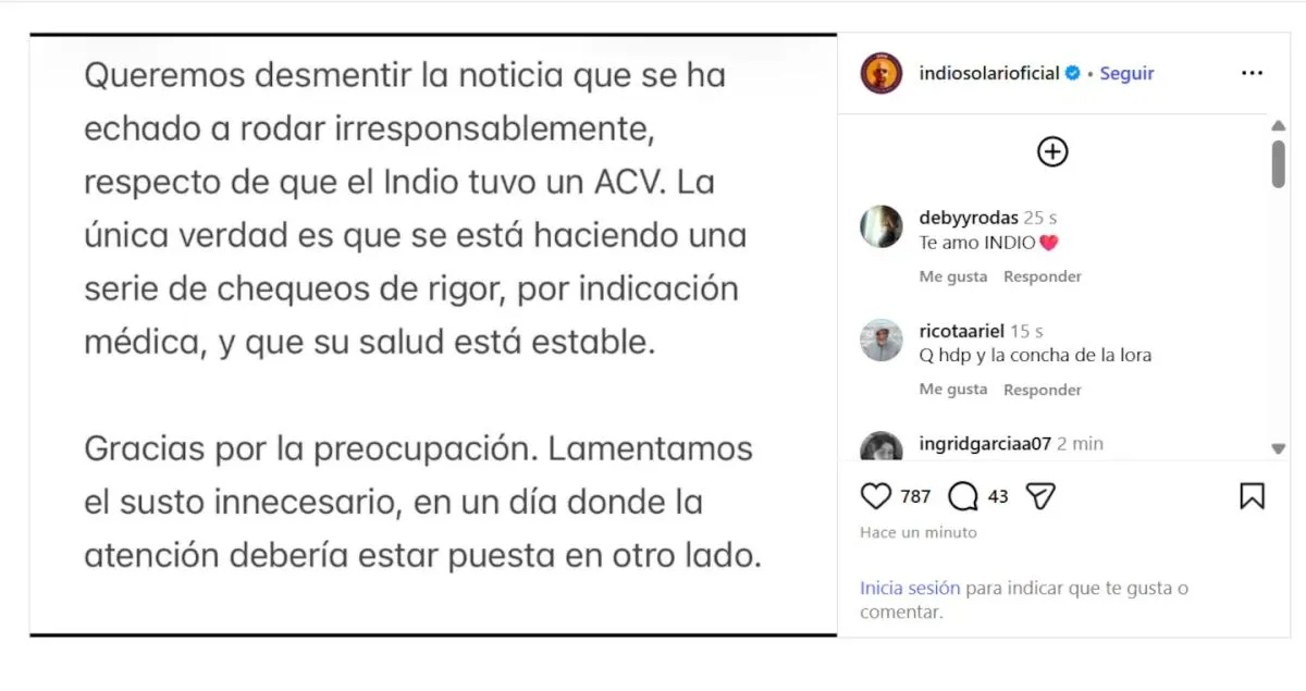 La información generó una inmediata preocupación entre sus seguidores, pero poco después el entorno del artista salió a llevar tranquilidad. A través de la cuenta oficial de Instagram del Indio Solari desmintieron que haya sufrido un ACV y aclararon que el músico solo se está realizando chequeos médicos de rutina.