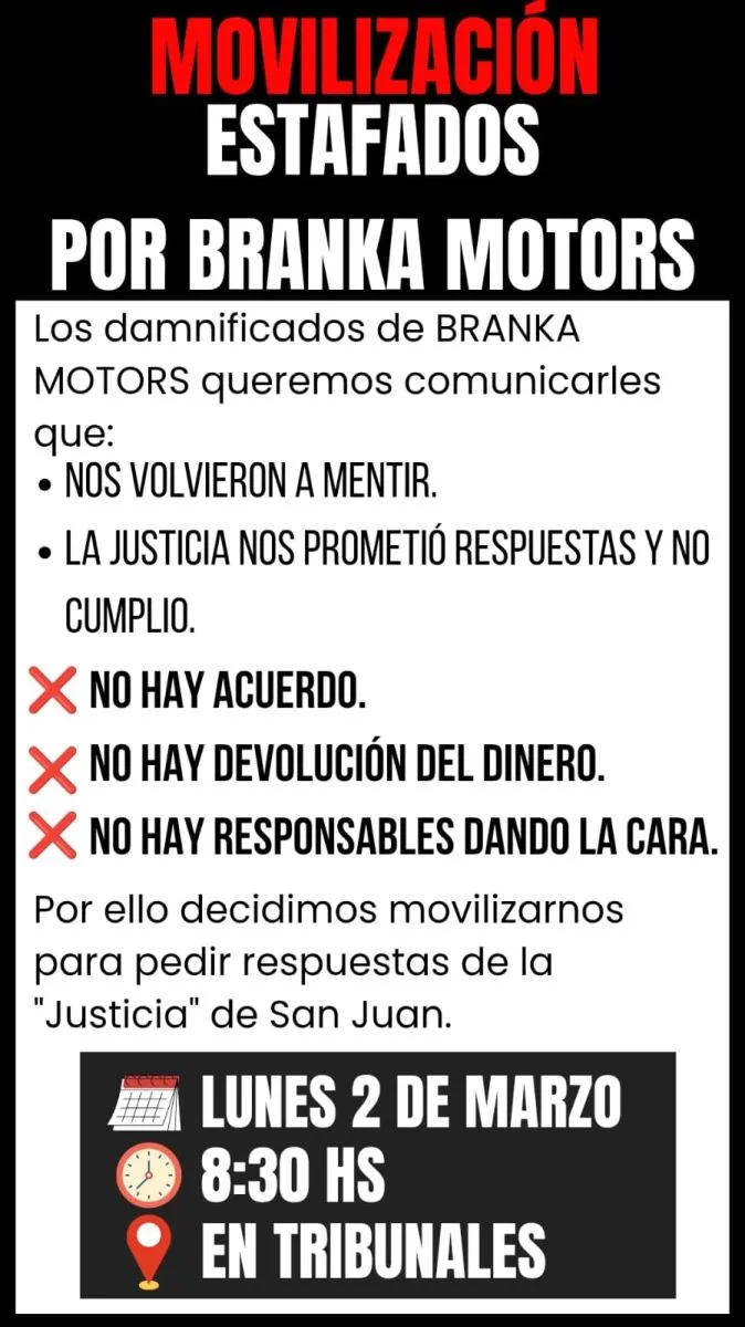 Los damnificados, quienes se concentraron en la puerta de Tribunales el martes pasado, en diálogo con 0264Noticias habían manifestado que estaban dispuestos a llegar a un arreglo con la empresa, lo que resolvería la acción penal con una reparación integral por parte Branka Motors.