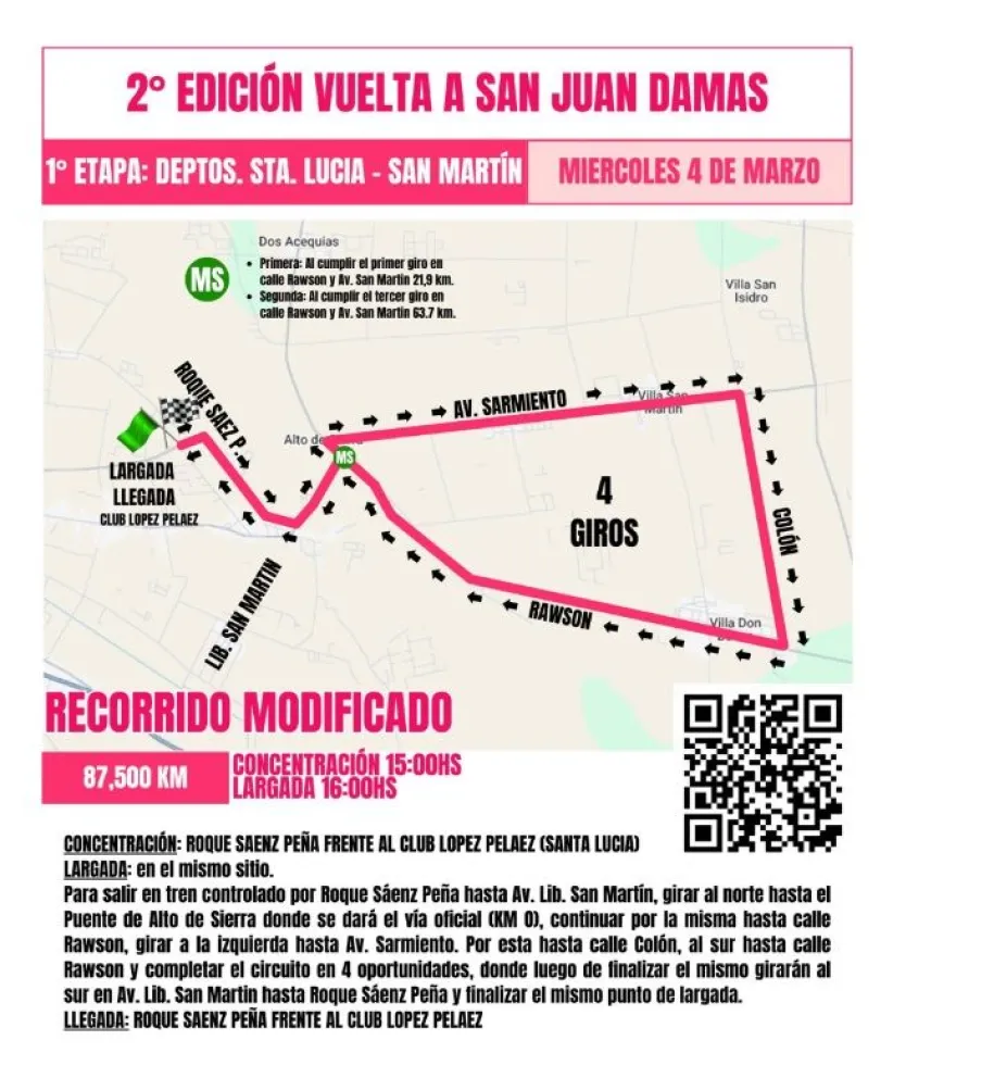 Con los cambios establecidos, la concentración y largada serán sobre calle Roque Sáenz Peña, frente al Club López Peláez, en Santa Lucía. Desde allí, el pelotón saldrá en tren controlado por Roque Sáenz Peña hasta Avenida Libertador General San Martín, donde girarán al norte hasta el Puente de Alto de Sierra, punto en el que se dará el vía oficial (Kilómetro 0).