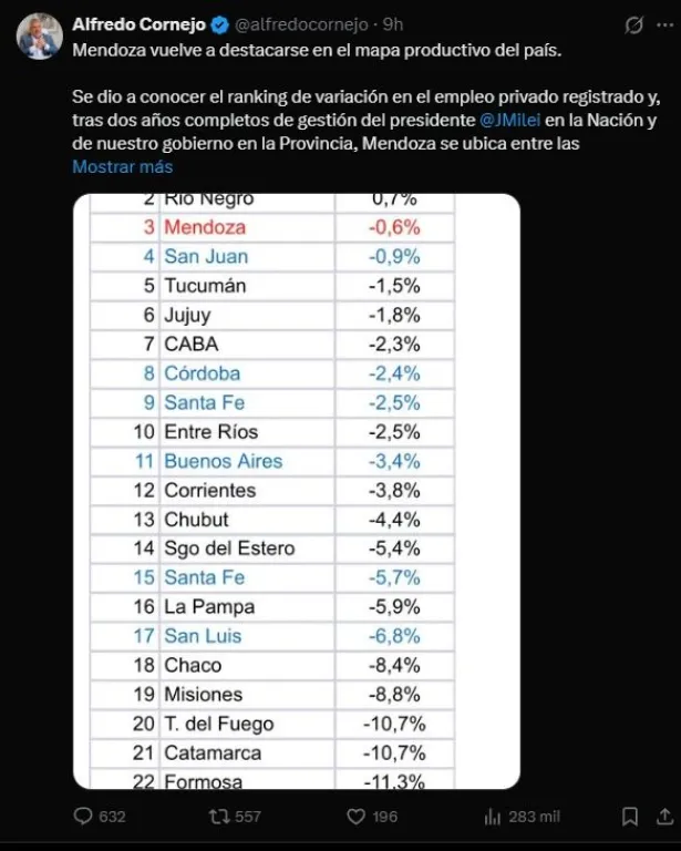 A pesar del resultado negativo, Cornejo difundió el ranking en su cuenta de la red social X y aseguró que Mendoza “vuelve a destacarse en el mapa productivo del país”, al ubicarse “entre las jurisdicciones con mejor desempeño en empleo privado registrado”.