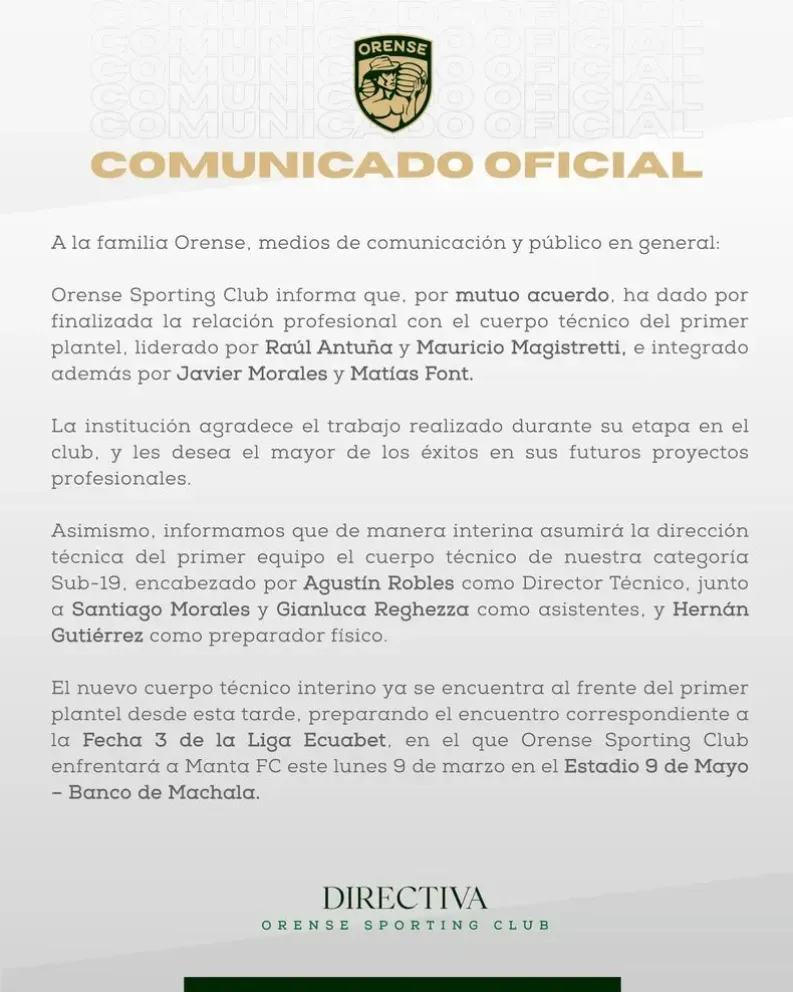 El técnico sanjuanino fue destituido de su cargo en el club ecuatoriano luego de la temprana eliminación en la Copa Sudamericana y un arranque irregular en la temporada. La dirigencia del Orense anunció su salida mediante un comunicado oficial.