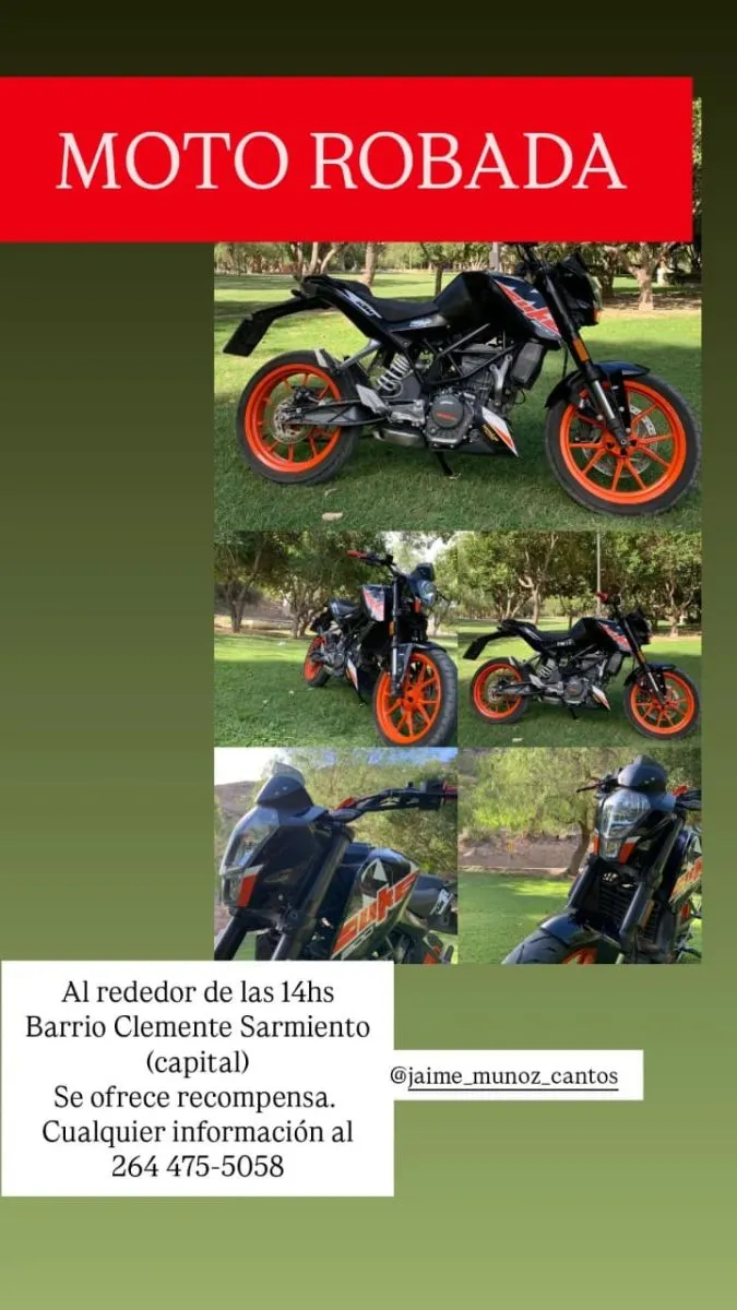 Según relató el propio Muñoz a 0264Noticias, su moto fue vista por última vez en la intersección de las calles Maipú y Jujuy. El vehículo es una KTM de color negro con detalles naranjas y, de acuerdo con lo que indicó el joven, no tenía patente colocada al momento del robo.
