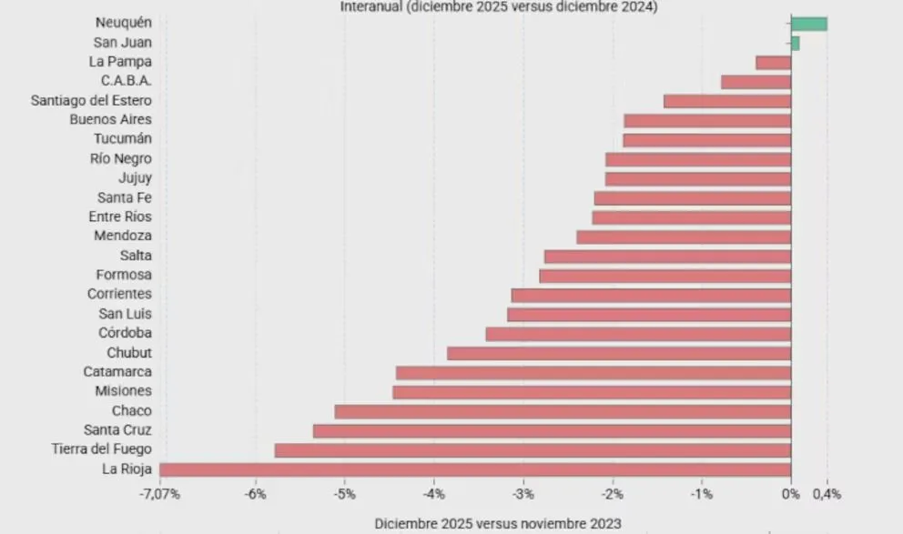 Aunque el informe no detalla cifras específicas por provincia en cada caso, sí marca una tendencia clara: 22 de las 24 jurisdicciones registraron caídas interanuales, y en 23 la situación empeoró desde el inicio del actual gobierno. San Juan se encuentra dentro de ese escenario general de contracción.