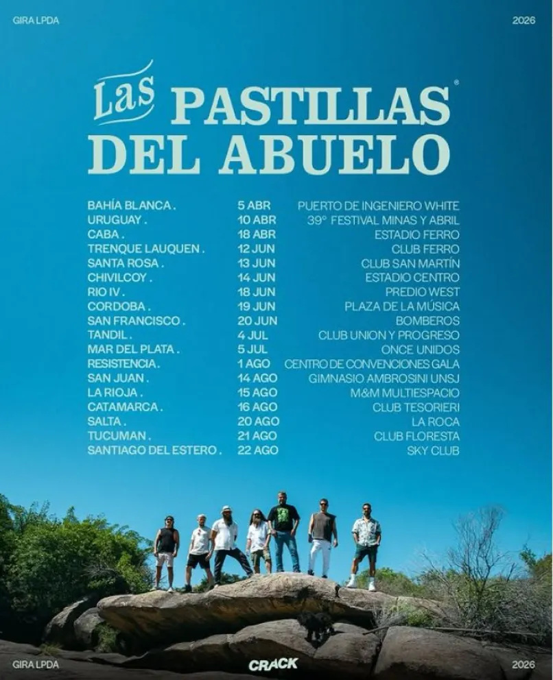 A través de sus redes sociales, Las Pastillas del Abuelo anunciaron su gira 2026 y la provincia no será la excepción. Luego de un parate que derivó en que algunos de sus músicos tomen sus caminos solistas, se reunirán nuevamente para hacer 18 shows en una gira que los llevará por varias provincias y hasta un show en Uruguay.