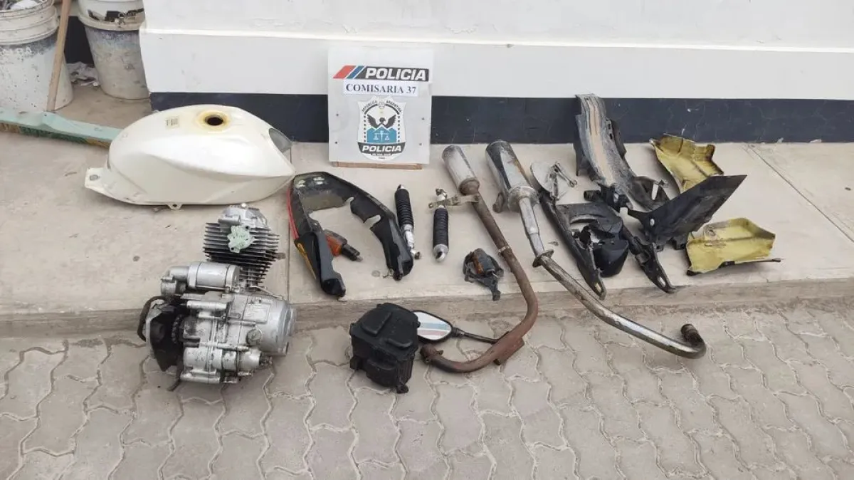 Los efectivos también allanaron una vivienda en el barrio Jardín Libertad. Allí secuestraron numerosas partes de motocicletas, entre ellas un motor Motomel, un orquillón, escapes de competición, tanque, amortiguador y diversas piezas. Todo quedó vinculado a un sujeto mayor de edad identificado como Sandovares.