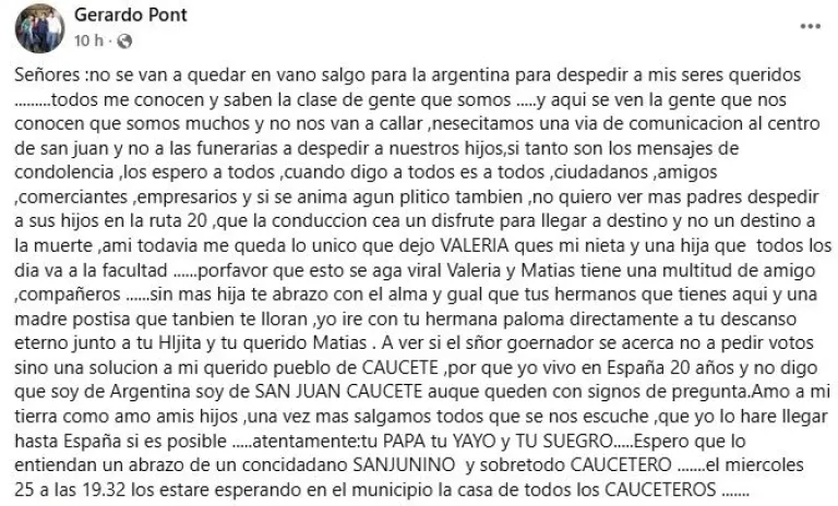 Gerardo Javier Pont, padre de Valeria del Valle Pont, escribió un emotivo mensaje en redes sociales mientras viaja desde España a San Juan para despedir a su hija, su yerno y su nieta. En su publicación llamó a una movilización en Caucete para exigir soluciones y evitar nuevas tragedias.