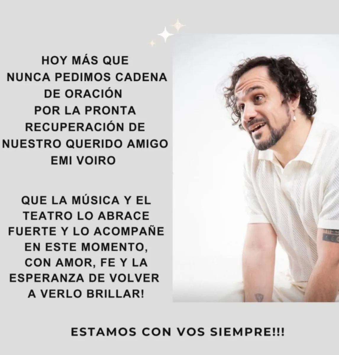 En medio de este difícil momento, allegados al músico impulsaron una cadena de oración en redes sociales, donde el mensaje de apoyo no tardó en multiplicarse. “Que la música y el teatro lo abracen fuerte y lo acompañen en este momento con amor, fe y la esperanza de volver a verlo brillar. Estamos con vos”, expresa uno de los posteos.