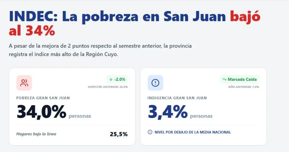 En el Gran San Juan, la pobreza alcanzó al 34% de las personas durante el segundo semestre de 2025, lo que representa una baja de dos puntos porcentuales en relación con el 36% registrado en el primer semestre del mismo año. En términos de hogares, el 25,5% se encuentra por debajo de la línea de pobreza. Es decir que en San Juan, la pobreza afecta a 190.697 personas sobre un total de 560.890, en términos de hogares, sería un total de 43.946 .