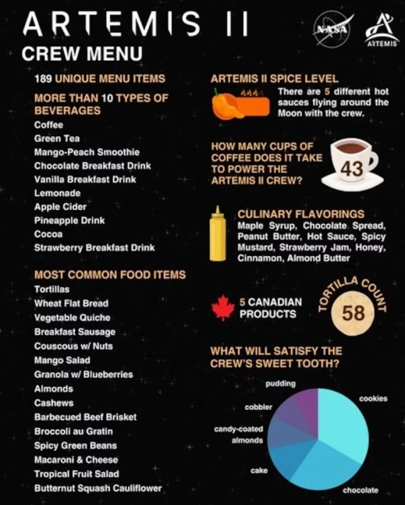 En ese contexto, la comida deja de ser un detalle secundario. A casi 400.000 kilómetros de la Tierra y sin posibilidad de recibir suministros, todo lo que consumirán los astronautas debe viajar desde el inicio. La nave no cuenta con refrigeración, por lo que los alimentos son exclusivamente no perecederos, procesados bajo métodos que garantizan seguridad y durabilidad.