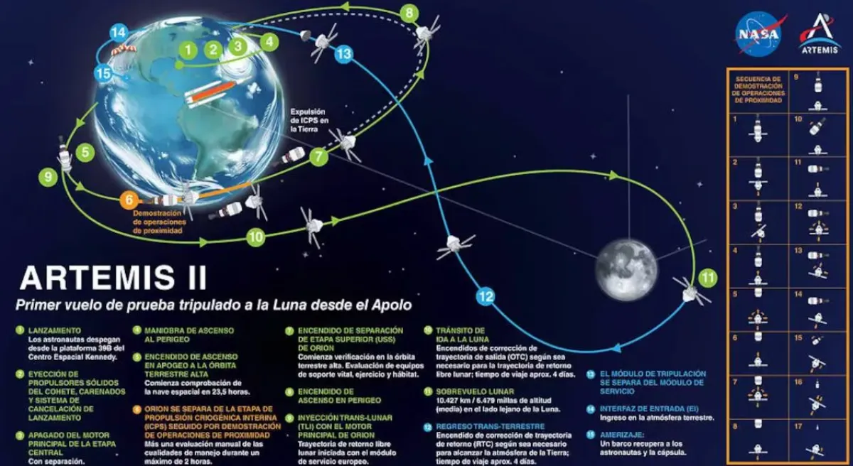 Además, comenzará el sobrevuelo de la Luna. La NASA indica que el máximo acercamiento ocurre en el día de vuelo 6, a entre 6400 y 9700 kilómetros de la superficie lunar, con un tramo de pérdida temporal de comunicaciones detrás de la cara oculta.