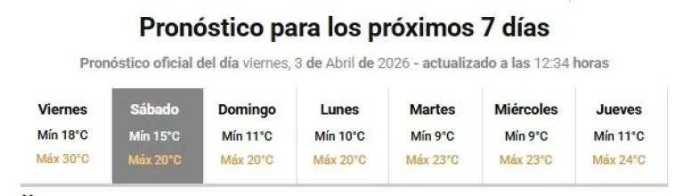Tras una semana en la que predominaron altas temperaturas (principalmente el lunes y el martes donde se registrarin hasta 37°), el calor veraniego parece despedirse definitivamente (aparentemente) a partir de este sábado. Así lo proyecta el Servicio Meteorológico Nacional en su pronóstico extendido, anticipando lo que se viene en los próximos días en materia climática.