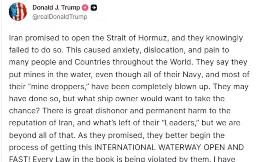 En su cuenta de Truth Social, Trump anunció que la marina estadounidense interceptará a todos los barcos que hayan pagado peaje a Irán en el estrecho de Ormuz.