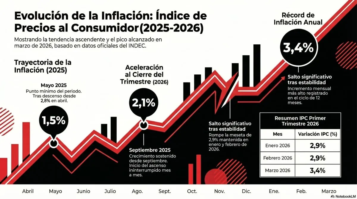 El Instituto Nacional de Estadística y Censos (INDEC) informó este martes que el Índice de Precios al Consumidor (IPC) registró una suba del 3,4% en marzo de 2026. Esta cifra representa una aceleración respecto a los meses de enero y febrero, donde el indicador se había mantenido estable en un 2,9%. Se trata del valor mensual más alto registrado desde abril del año pasado.