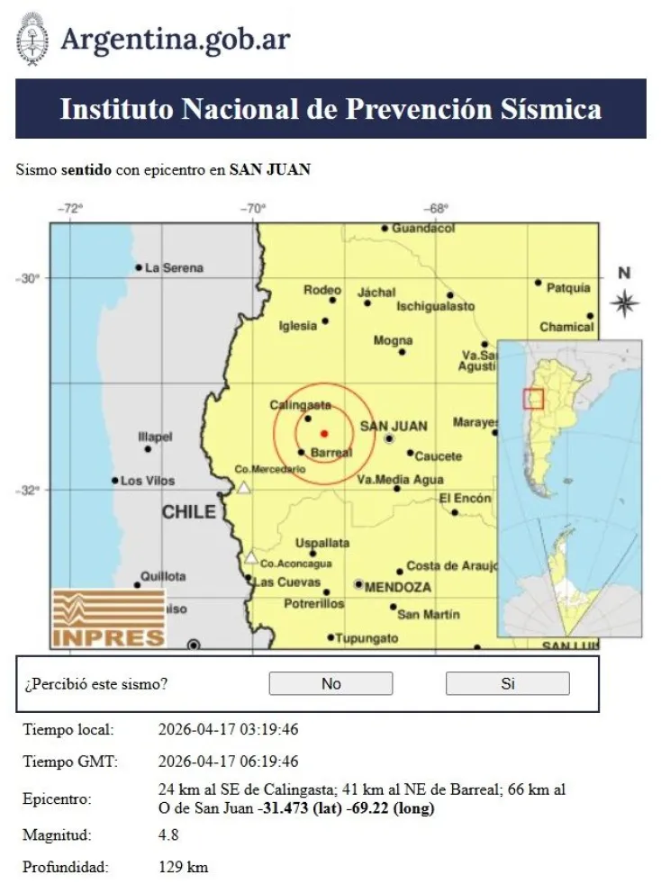Cinco horas después, el INPRES informó sobre el sismo de 4.8° que sacudió la madrugada sanjuanina