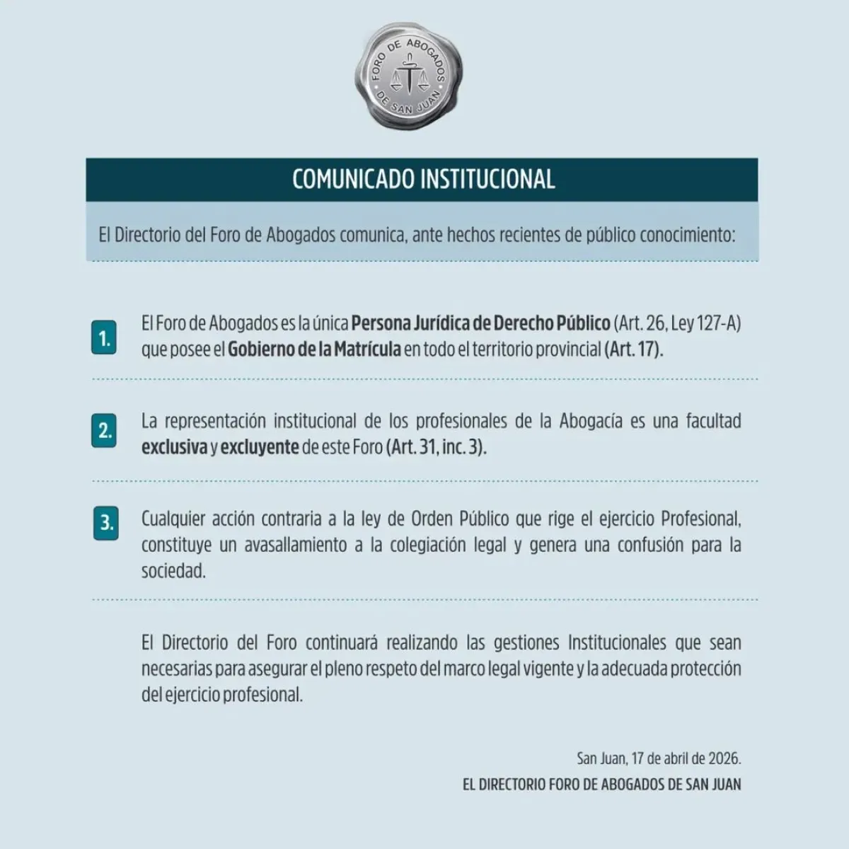 Salinas indicó que venían estudiando la problemática hace dos días y que lo planteó como un informe de presidencia. Al tratarse el tema, explicó que “consideramos que había intereses contrapuestos. Habíamos detectado que una asociación civil se arrogaba la representación de la abogacía litigante de San Juan. Por lo tanto, va en contra de la ley del ejercicio de la abogacía, que en su artículo 31, inciso 3, indica que el único que tiene la representación de los abogados habilitados es el Foro”.