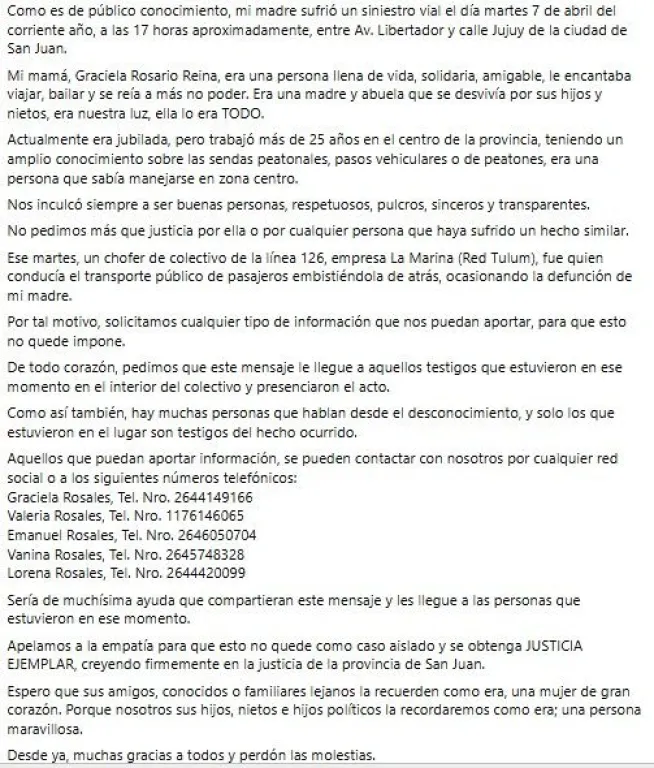 La familia de Graciela Rosario Reina, la mujer de 64 años que murió tras ser atropellada por un colectivo en Capital, inició una campaña a través de redes para encontrar testigos del hecho y avanzar en el esclarecimiento de lo ocurrido.