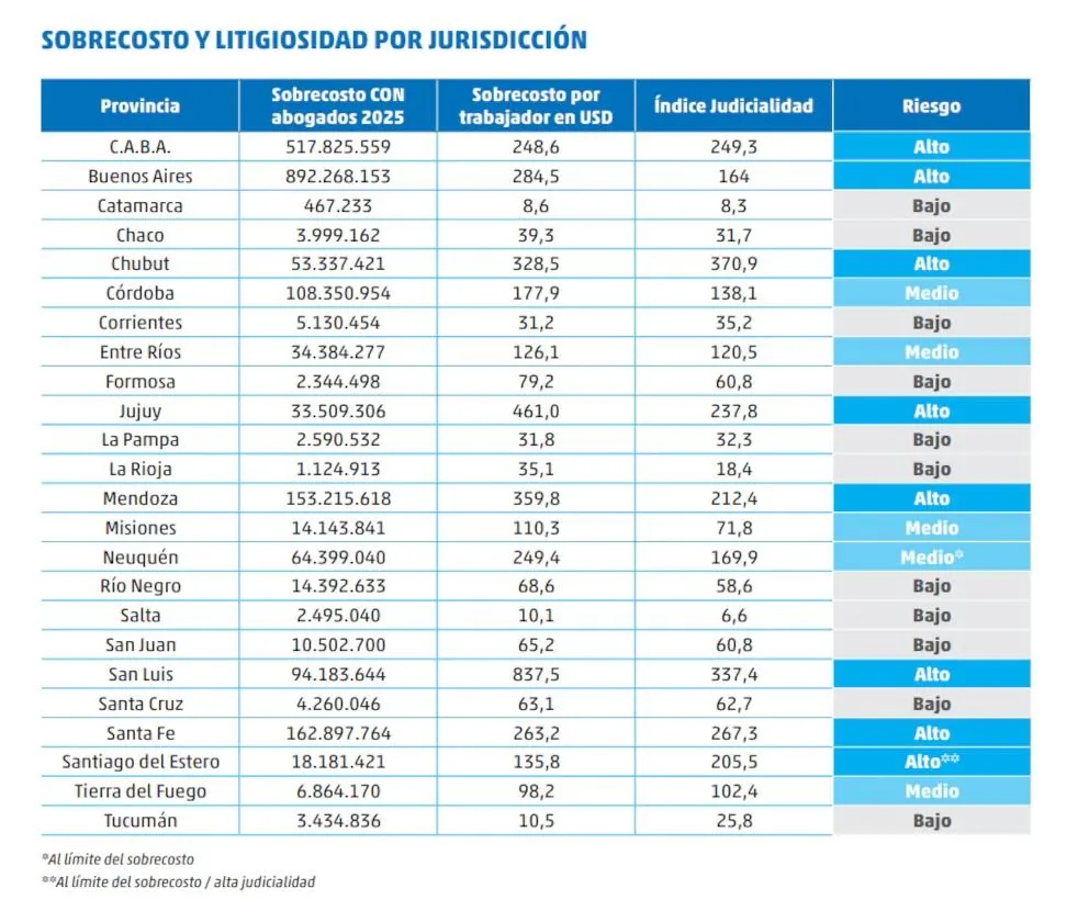 El contraste es especialmente marcado con San Luis, que aparece como el caso más extremo del país con 337 de judicialidad y USD 837 por trabajador. También Mendoza muestra valores superiores, con 212 de judicialidad y USD 360 por trabajador.