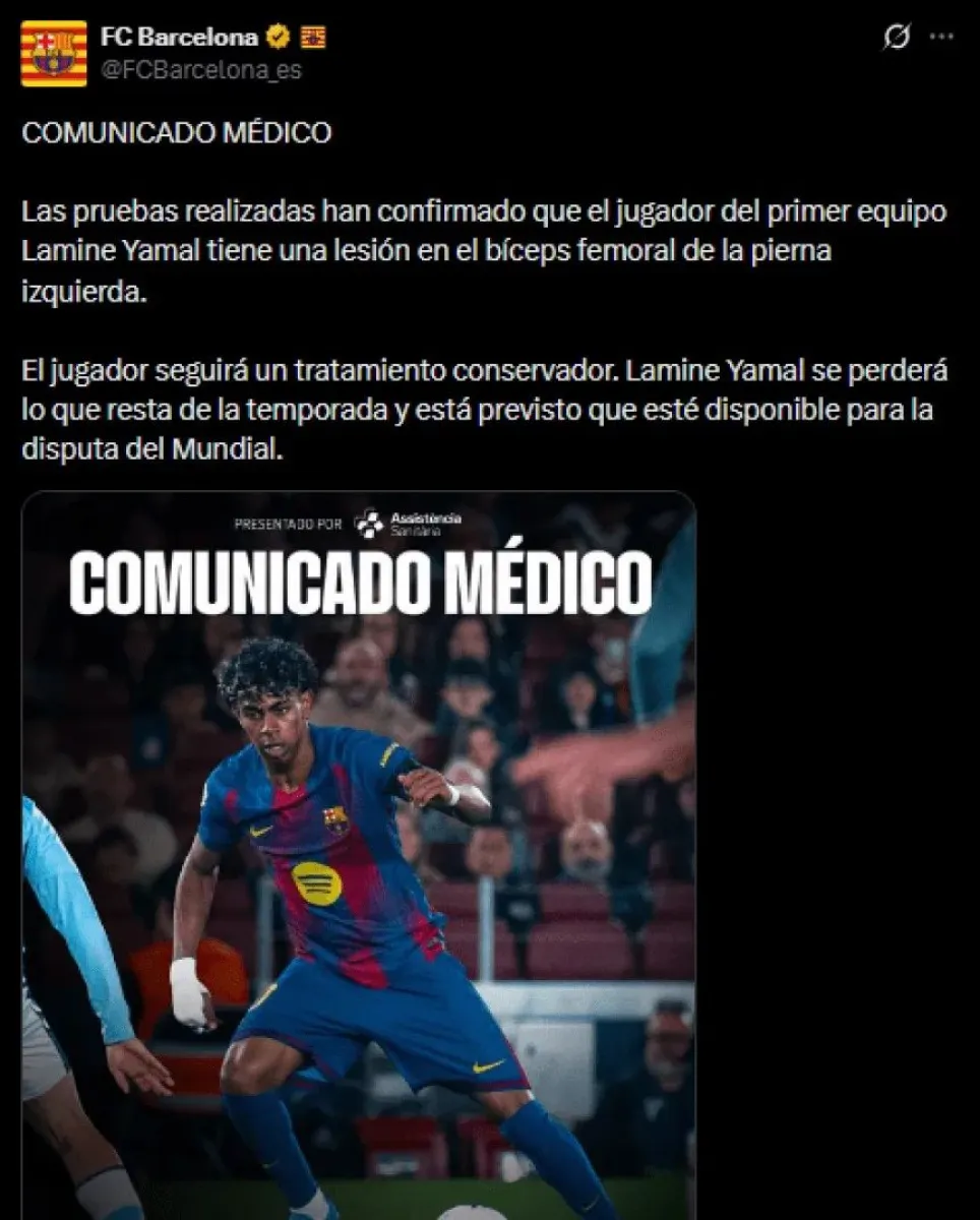 Esto le permitirá, si no surge ningún imprevisto en el medio del proceso de recuperación, llegar en óptimas condiciones a la Copa del Mundo“El jugador seguirá un tratamiento conservador. Lamine Yamal se perderá lo que resta de la temporada y está previsto que esté disponible para la disputa del Mundial, cerró el comunicado de Barcelona.