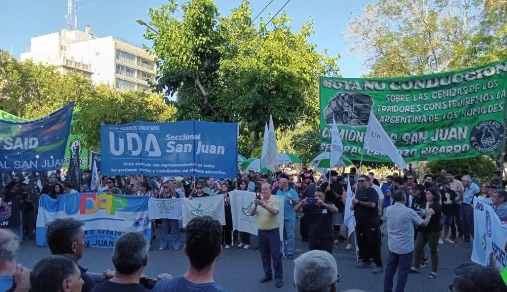 EN EL CENTRO Un amplio abanico de gremios, sindicatos y agrupaciones marcharon en San Juan contra la reforma laboral impulsada por Milei